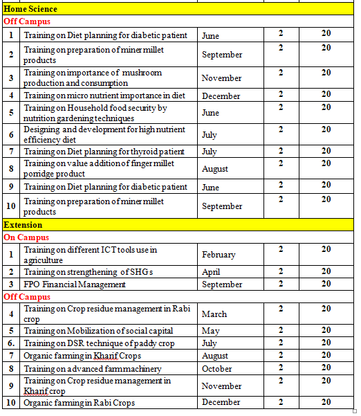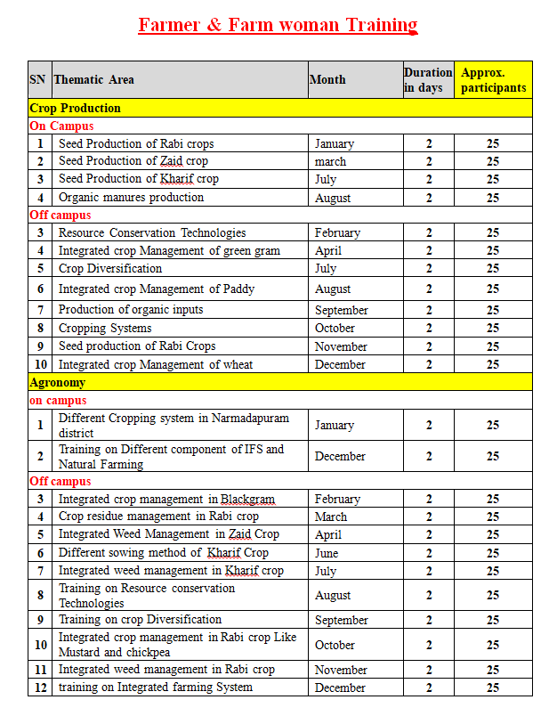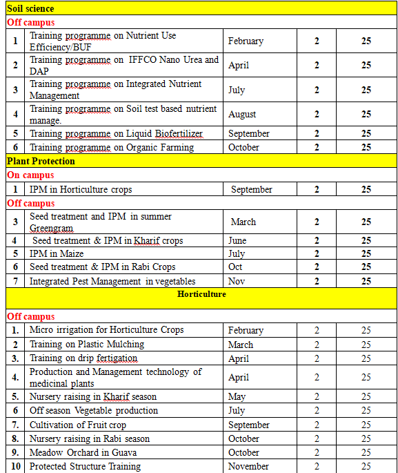 कृषि विज्ञान केंद्र गोविन्दनगर, नर्मदापुरम द्वारा संकुल अग्रिम पंक्ति प्रदर्शन – तिलहन, राष्ट्रीय खाद्य तेल - तिलहन मिशन (NMEO-OS) वर्ष - 2025-26 के अंतर्गत सिवनीमालवा ब्लोक के ग्राम भेरोपुर एवं जीरावाह में कृषक प्रशिक्षण सह आदान वितरण कार्यक्रम का आयोजन दिनांक 16 एवं 18 जून को किया गया, कार्यक्रम में किसानो को सोयाबीन की वैज्ञानिक खेती के बारे में विषय विशेषज्ञों द्वारा जानकारी प्रदान की गई, इस कार्यक्रम में परियोजना के नोडल अधिकारी ब्रजेश कुमार नामदेव द्वारा किसानो को परियोजना की विस्तृत जानकारी देने के साथ साथ मृदा परिक्षण का महत्त्व, मृदा नमूना लेने की विधि, फसल की नवीन किस्मो, बीज उपचार की जानकारी प्रदान की, वैज्ञानिक राजेन्द्र पटेल द्वारा सोयबीन में खरपतवार प्रबंधन, मृदा परिक्षण आधारित पोषक तत्व प्रबंधन, एवं फसलो में पोषक तत्वों के महत्त्व की जानकारी किसानो को दी, तत्पश्चात डॉ संजीव कुमार गर्ग प्रभारी वरिष्ठ वैज्ञानिक एवं प्रमुख द्वारा सोयबीन बुबाई की विधियो की जानकारी विस्तार पूर्वक प्रदान की गई इस कार्यक्रम में उन्नत तकनिकी प्रदर्शन हेतु 125 किसानो का चयन किया गया एवं आदान सामग्री में बीज बीज उपचार हेतु ट्राईकोडर्मा, पी.एस.बी. (स्फुर घोलक जीवाणु) कल्चर प्रदान किया गया, प्रशिक्षण कार्यक्रम सह आदान वितरण कार्यक्रमों में लगभग 100 किसानो ने सहभागिता की |